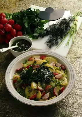 Wash the potatoes and cook in salted water for about 20 minutes. Then rinse with cold water and remove the skin. Let it rest a little. In the meantime clean, wash and quarter the radishes.