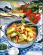 Cut the potatoes into slices. Season vinegar with salt and pepper and heat in a pot. Stir in 1 tablespoon of oil and pour over the potatoes while still hot. Fold in remaining prepared ingredients.