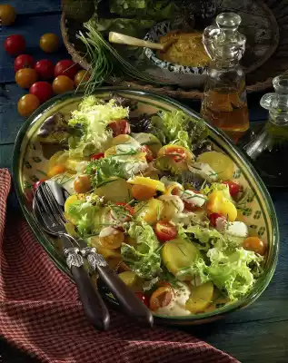 Wash the potatoes and cook in boiling water for about 20 minutes. Clean, wash and cut the salad into bite-sized pieces. Wash tomatoes, dab dry and cut in half. Mix mayonnaise, mustard, oil and vinegar. Season with salt and pepper. Wash chives, dab dry and cut into small rolls.