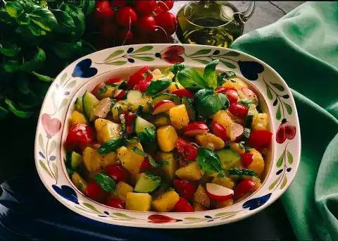 Wash the potatoes and cook in salted water for about 20 minutes. Drain, rinse with cold water and remove the skin. Let the potatoes cool down. Clean and wash the tomatoes, cucumber and radishes. Dice the tomatoes. Quarter cucumber lengthwise and cut into slices. Quarter the radishes. Peel and finely dice onions. For the marinade, mix onion cubes, vinegar, mineral water, salt and pepper. Cut the potatoes into pieces and let them simmer covered in the marinade for about 30 minutes. Then add the rest of the prepared vegetables. Wash herbs and cut finely. Mix vegetables, herbs and oil into the potatoes. Season salad again