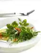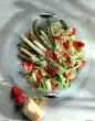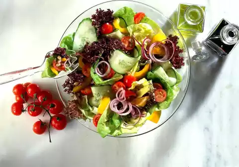 Clean, wash and pluck the salad into bite-sized pieces. Clean, wash and chop the peppers. Wash and halve the tomatoes. Wash and clean the cucumber and slice it lengthwise.