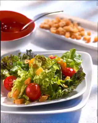 Mix lettuce, tomatoes and vinaigrette in a bowl. Season salad with salt and pepper. Sprinkle with croutons. Garnish with chervil as desired.