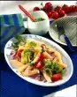 Clean, wash and drain the salad and pluck it into pieces. Wash and halve the cherry tomatoes. Remove the crust of the toast and cut the toast into cubes. Heat the oil in a pan and fry the bread cubes until crispy.