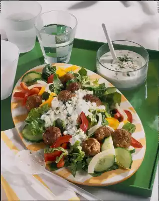 Mix all the salad ingredients with the meatballs and sauce and serve on a plate.