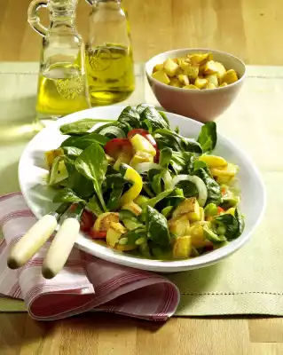 Peel onion and cut into rings. Clean the salad, wash thoroughly and spin dry. Mix salad, onion and paprika and arrange on a plate with potatoes. Drizzle with dressing. Add remaining potatoes.