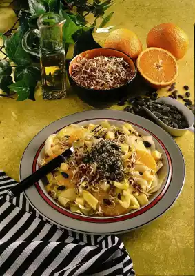 Squeeze the rest of the orange. Prepared ingredients and two tablespoons of pumpkin seeds with lemon and orange juice mix and let it soak a little. For the pumpkin pesto grind the remaining seeds finely. Mix with pumpkin seed oil.