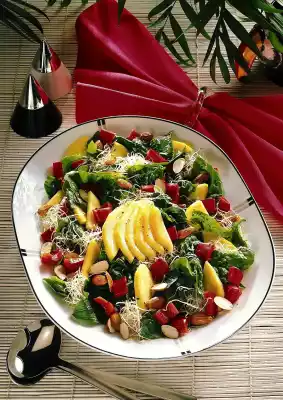 Clean, wash and chop the peppers. Peel the mango half and cut the flesh in thin slices from the stone. Halve the almonds. Arrange all salad ingredients mixed on a plate. For the vinaigrette, mix vinegar, salt and lemon pepper.