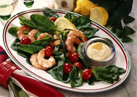 Season dip to taste with salt, pepper and lemon juice. Remove the scampi from their skin, leaving the tail pieces standing. Cut the scampi in the back and remove the black intestine. Arrange spinach, cherry tomatoes and scampi on a plate and sprinkle with the bread croutons. Pour the dip into a small bowl. Serve salad and dip garnished with lemon