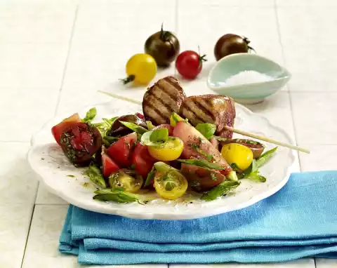 Season medallions with salt and pepper and put two medallions each on a skewer. Heat oil in a grill pan (or normal pan) and fry the medallions on both sides. Place the meat on an ovenproof dish (or mould) and cook in a preheated oven (electric cooker: 200 °C/ convection oven: 175 °C/ gas: level 3) for eight minutes. Mix tomatoes, herbs, vinegar and olive oil in a bowl and season with salt, pepper and a little sugar. Arrange pork medallions and tomato salad