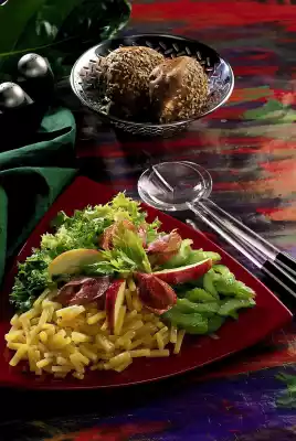 Mix vinegar, sugar, salt and pepper. Whip the oil into the mixture. Pour the marinade over the salad ingredients. Arrange apple slices and salami on top. Serve garnished with celery green. Serve with wholemeal rolls.