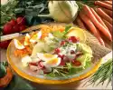 Peel, wash and cut the turnip into fine sticks. Steam for 10 minutes in a little salt water. Clean and wash the celery, put some green aside for garnishing. Cut celery stalks into slices and blanch in boiling salted water for about 3 minutes.