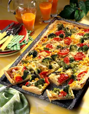 Cut the tomatoes into slices, cut the spring onions in half lengthwise. Roll out the dough on a floured work surface to a rectangle (32 x 40 cm). Grease the baking tray. Place the dough on the baking tray and press the edges slightly up. Spread broccoli, tomatoes, spring onions and corn on the dough. Stir sour cream, milk and remaining eggs until smooth. Season with salt and nutmeg. Pour egg milk over the vegetables. Season with salt and pepper. Grate the Gouda and spread on the vegetable pie.