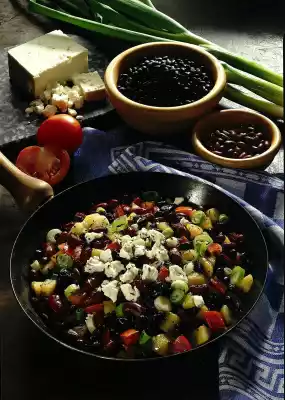 Crumble the feta cheese and sprinkle over the beans before serving.