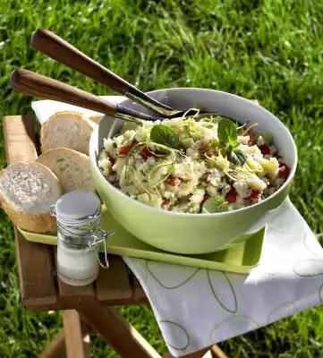 Season with salt and pepper. Fold in the oil. Stir in part of the mint strips. Mix the couscous and half of the vinaigrette in a large bowl. Add cucumber, tomatoes and the rest of the mint strips and season again with salt, pepper and cumin.