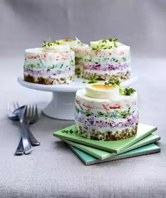 To serve, boil the egg in boiling water for about 10 minutes, rinse with cold water, peel and slice. Serve tartlets garnished with slices of egg and cress