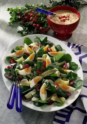 Stir the diced peppers into the sauce. Peel the eggs and cut them lengthwise into six. Arrange lamb's lettuce, mushrooms, cheese, onion rings and ice cream on a plate. Sauce in a bowl