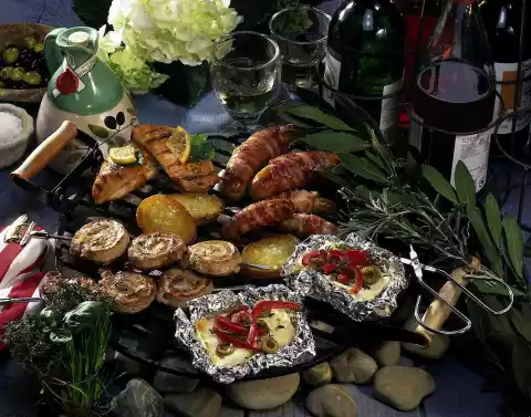 Heat the rest of the olive oil in a frying pan, briefly toss the peppers, garlic and olives in it. Season with salt and pepper. Place each piece of feta cheese on aluminium foil, spread braised vegetables on top and sprinkle with thyme. Close aluminium foil tightly. Drain the potatoes, quench them and cut them into approx. 1 cm thick slices. Spread the cut surfaces of the potato slices thinly with oil. Wrap each sausage with a slice of bacon. Cut each cutlet into 7-8 slices and put them on 6 skewers. Remove the chicken fillet from the marinade, dab dry with kitchen paper and grill for approx. 8 minutes on each side. Sprinkle with lemon pepper as desired and garnish with lemon slices and parsley. Grill the feta cheese parcels for 10-12 minutes. Grill potatoes for 5-6 minutes on each side and sprinkle with salt. Grill skewers for about 10 minutes while turning. Grill the small sausages on each side for about 3 minutes and the large sausages on each side for 4-5 minutes