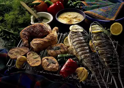 Wash the chicken legs and pat dry. Mix 5 tablespoons of olive oil and some lemon pepper. Spread the chicken thighs with it, sprinkle with some salt and paprika powder and let it stand for about 15 minutes. Wash trout thoroughly and pat dry. Rub inside and outside with salt and pepper. Wash 1 lemon hot and cut in half.