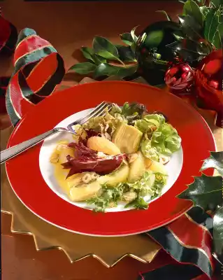 Wash salad leaves and pluck into bite-sized pieces. For the marinade, mix grapefruit juice, vinegar and oil. Season with salt, pepper and sugar. Arrange the prepared ingredients carefully mixed with the marinade on plates