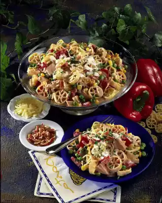 Cook the pasta in plenty of boiling salted water for 8-9 minutes. Pour onto a sieve, rinse under cold water and drain. Defrost peas, drain corn. Clean, wash and dice the peppers. Dice the sausage as well. Peel and chop onion. Mix yoghurt, mayonnaise, ketchup and onion.