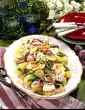 Season with vinegar, salt and pepper. Mix noodles, vegetables and sauce and let it soak a little. Wash the chives, dab dry and cut into small rolls. Crisp out the bacon in a pan, drain on kitchen paper and let it cool down. Crumble the bacon. Season pasta salad with salt, pepper and vinegar and serve sprinkled with chives, bacon and cheese