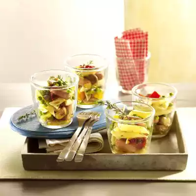 Fold down the paprika oil you have collected. Drain the pasta and let it drain. Drain the sausages and let them drain. Mix both with peas, mushrooms, pepper pieces and vinaigrette. Arrange the pasta salad in glasses.