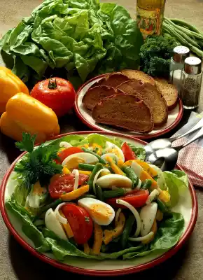 Spread eggs and tomatoes over it. Pour the marinade over the salad and garnish with the herb bouquet. Serve with slices of brown bread toasted in butter.