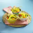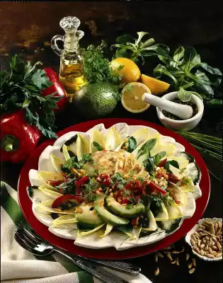 Cut the flesh into half rings and sprinkle with lemon juice. Clean, wash and drain the lamb's lettuce. Cut out chicory stems in a wedge shape. Loosen the leaves, wash them and put them on 4 plates.