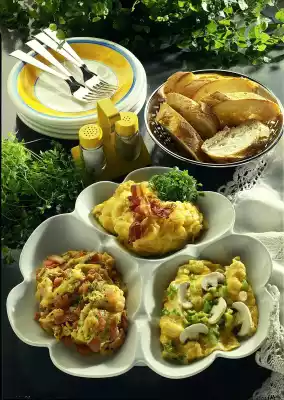 Put the eggs in a bowl and whisk them. Season to taste with salt, pepper and nutmeg. Spread the egg mixture over 3 bowls. For the cheese scrambled eggs fry the bacon strips until crispy. Grate cheese finely and fold into an egg mixture.