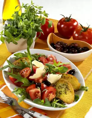 Clean and wash the rocket and drain well in a sieve. Clean, wash and roughly dice the tomatoes. Mix tomatoes, rocket, olives and slices of bread and arrange on four portion plates. Spread the vinaigrette evenly on top and serve garnished as desired with marjoram and parmesan slices.