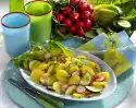 Remove the slices of bread from the pan and put them aside. For the vinaigrette, mix vinegar, salt, pepper, sugar and mustard with the whisk of the hand mixer. Whip the olive oil into the vinaigrette bit by bit.