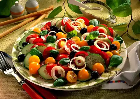 Boil eggs hard in about 10 minutes, rinse with cold water and peel. Wash tomatoes and cucumber. Halve cherry tomatoes, cut remaining tomatoes and cucumber into slices. Peel onion and cut into rings.
