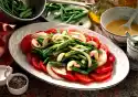 Wash the basil, pluck the leaves from the stems. Arrange prepared salad ingredients and olives on a plate and garnish with some basil leaves. Sprinkle with pepper. Coarsely chop the remaining basil.
