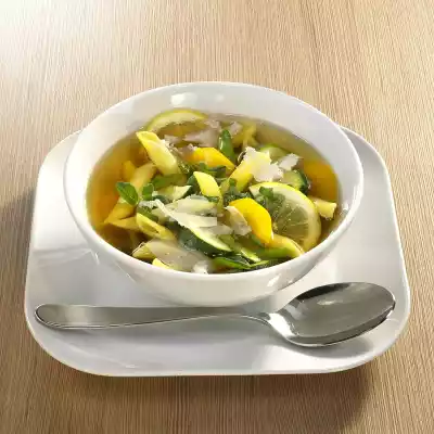 Clean and wash spring onion, dab dry and cut diagonally into pieces. For the last 4-5 minutes add zucchini, peppers, spring onions and lemon slices and cook. Slice parmesan and sprinkle over the soup. Garnish with oregano