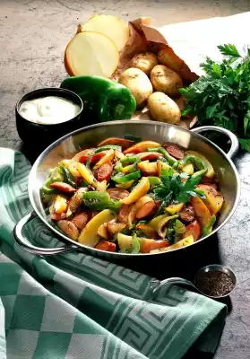 Peel the potatoes. Depending on size, cut lengthwise into quarters or eighths. Onion likewise peel, cut in columns. Clean, wash and cut the bell peppers into strips. Cut the sausages into diagonal slices.
