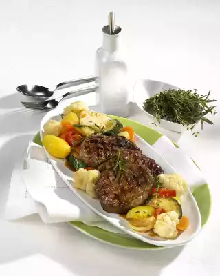 Season vegetables with salt, pepper and vinegar. Remove the steaks. Drain the resulting roast from the grill. Arrange steaks and vegetables. Sprinkle with gravy. Garnish with remaining herbs.