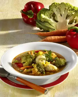 Peel and chop the onion. Clean, wash and cut the leek into rings. Peppers clean, wash and cut into pieces. Clean, wash and slice the carrots. Clean the Romanesco, cut the florets from the stems, wash and drain well.