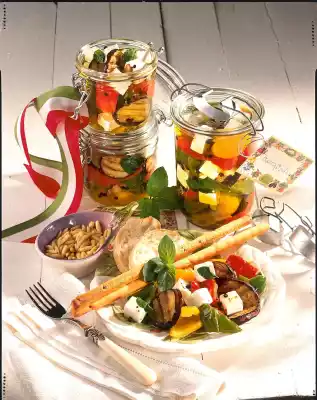 Top up with olive oil. Close the glasses and let them steep a little. Italian white bread and Grissini sticks taste good with it.