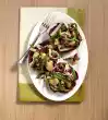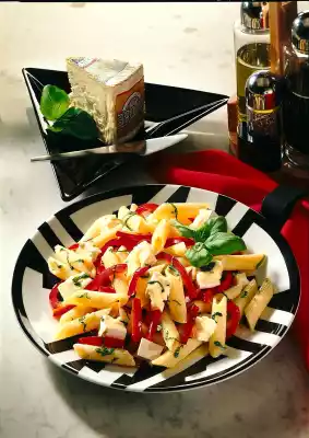 Drain the pasta and let it drain. Add pasta, basil and cheese to the peppers and mix well. Heat for 2-3 minutes while turning. Arrange everything and garnish with the rest of the basil