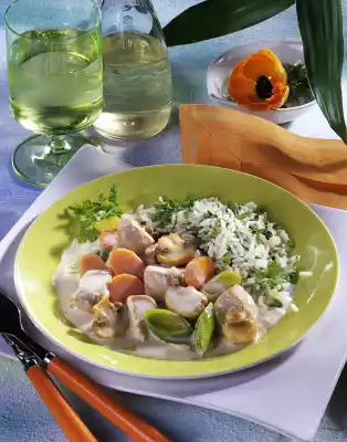 Steam onion in frying fat until transparent. Add carrot and leek and steam for about 3 minutes, season. Sprinkle with flour and sweat. Stir in 150 ml water, milk and stock, bring to the boil. Simmer for about 5 minutes while stirring. Heat up meat and mushrooms again. Season to taste with salt and pepper