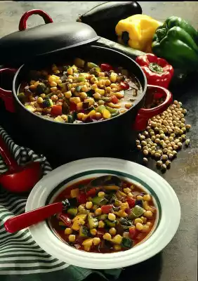 Soak the chick peas in 1 litre of water overnight. Bring to the boil with the soaking water, the vegetable stock and the herbs of Provence. Cover and cook over medium heat for about 1 1/2 hours. Wash and clean the aubergine and courgette. Cut both lengthwise into strips, then dice. Clean, wash and dice the peppers.