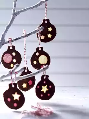 Roll out the dough 2-3 mm thinly on a work surface dusted with flour. Using a template (approx. 6 cm Ø), cut out approx. 60 cookies, knead the dough again and again, roll out the same way and cut out cookies. 3. make a hole in the biscuits with a small punched spout to hang them up and cut out circles and stars with cutters as desired. Place 1/3 of the biscuits on a baking tray lined with baking paper. Bake in a preheated oven (electric cooker: 175 °C/ convection oven: 150 °C/ gas: see manufacturer) for approx. 12 minutes