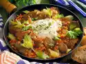 Peel and chop the onion. Clean and wash the cabbage and remove the stalk. First cut the cabbage into slices, then into pieces. Clean or peel and wash soup greens, bell peppers, celery and carrots.
