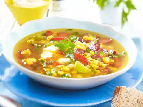 Remove leaves from the corn. Wash the corn, grate dry. Cut grains from the cob. Quarter peppers, clean, wash and cut into strips. Celery clean, wash and cut into slices. Halve sausage lengthwise and also cut into slices.
