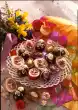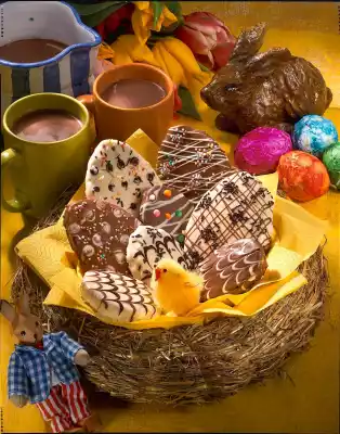 In the meantime cut out two Easter egg templates of different sizes from paper (large egg approx. 12 x 7 cm/ small egg approx. 8 x 5 cm). Place the templates on the cake and cut out about 10 large and 6 small Easter eggs. Melt the couverture separately on a hot water bath. Spread half of the dough eggs with white, the other half with whole milk couverture. Decorate the eggs as you like with chocolate coating, crumbles and pearls. Leave to dry