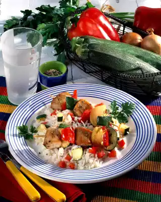 Deglaze with broth and simmer covered for 2-3 minutes. Arrange fillet skewers and vegetables on the rice