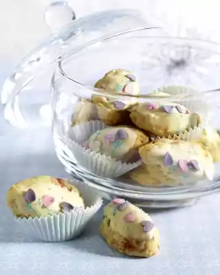 Use 2 tablespoons of the dough to cut off the cams on the baking trays and bake them one after the other in a preheated oven (electric range: 200 °C/ convection oven: 175 °C/ gas: level 3) for 6-7 minutes until golden brown. Remove and let cool off. Melt the chocolate over a warm water bath. Dip the cams halfway, drain thoroughly, place back on the baking tray and decorate with decorating sugar and sugar hearts. Leave to dry. If necessary, place in paper cups