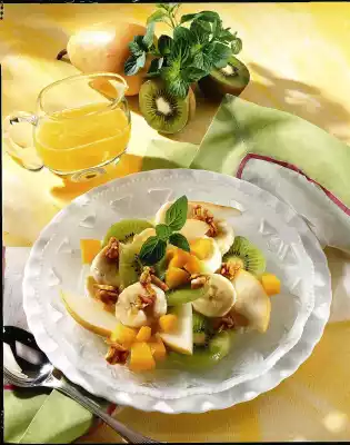 Dice the peaches. Peel and slice bananas and kiwi. Mix the fruit. Mix orange juice, honey and liqueur. Drizzle fruit with marinade and arrange on plates. Chop almond brittle coarsely and sprinkle on top.