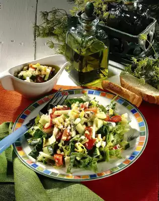 Boil egg in boiling water for about 10 minutes until hard, quench cold and let it cool down. Clean, wash and drain the salad and cut into strips. Wash, clean and chop the tomatoes and cucumber. Wash, peel and cut the kohlrabi into fine sticks. Peel and chop onion.