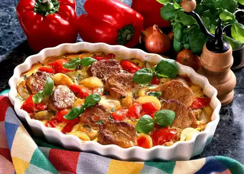 Wash pork medallions, dab dry and fry in hot oil for about 2 minutes on each side until golden brown. Peel onions and cut into slices. Season medallions with salt and pepper and remove from the pan. Fry the onion slices in the frying fat. Clean, wash and cut the peppers into large cubes. Wash basil, cut half of it into fine strips. Stir cream cheese, milk and eggs until smooth. Add basil strips and season the sauce with salt and pepper. Layer medallions, onions and peppers in an ovenproof casserole dish (approx. 25 cm long). Pour over the cream cheese and bake in a preheated oven (electric range: 200 °C/ gas: level 3) for 25-30 minutes. Garnish with the remaining basil. Serve sprinkled with the coarse pepper